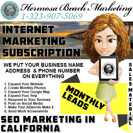 Hermosa Beach Marketing welcomes your business to our “California” style of “seo internet marketing”. We sell our (sales material for search results) services in a bundle (with website computering) called the Presidential Power Package. You can purchase à la carte assistance hourly, but our bundle exists because your business doesn’t have time for the following monthly services: hosting, SSL, website administration, custom emails, new website pages, writing, YouTube video creation, photo ad creation, installation into search engines, Google Maps, posting sales material on social media, Facebook, Pinterest, review responding, Yelp, custom monthly emails, Google Ad management, competitive upkeep, etc.