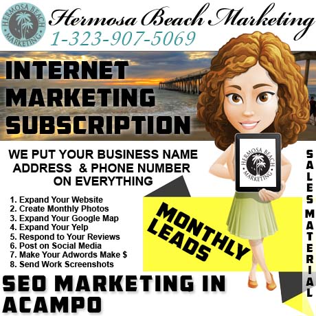 We can target search results for the “Acampo” area first and then work outwards, targeting and maintaining promotions to the further cities as we go. The most important thing about subscribing an internet marketing bundle is that you do nothing. Just like you started with nothing but a phone number, business name, and address; that’s about all that we need too. Call today and jump on the full-service digital marketing train!