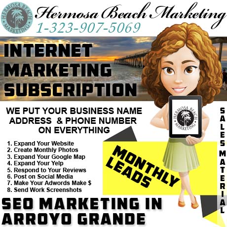 At Hermosa Beach Marketing, we sell the Presidential Power Package. This product focuses on “seo internet marketing” and web advertising in “Arroyo Grande“. Once we start, we make new sales material with your business’ details on them to use in search results. Then we pump them, post them, and advertise them in free and paid areas online.