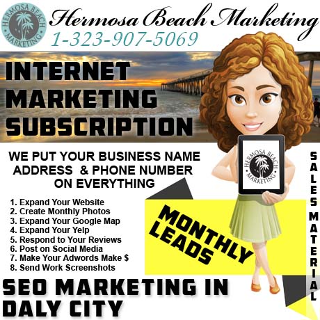 Hermosa Beach Marketing offers the ability to advertise in search results each month, for free and paid, with the service bundle that we offer called the Presidential Power Package. Our staff follow the guidelines in our product so you can get great sales material created for and marketed in search results for “Daly City” and other areas that you can do business in. Monthly, new sales material for search results display your business name, address, and phone number using “seo internet marketing” labor and internet ads as well. Signing up includes web server chores also, but you’ll get more information on that entire complicated mess of chores when you call today.