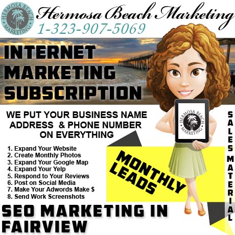 “Seo internet marketing” is the art of making sales material and monetizing them through advertising. “Fairview” may not be big enough for your business to grow larger. Sales material will need to be created monthly to keep the internet fresh and know that your business is alive. Compete well with technical marketers that fight for your sales leads. Call today and order our product for small business promotion, the Presidential Power Package.