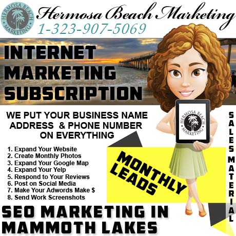 Hermosa Beach Marketing is offering the science of making sales material online, in one easy-to-order bundle called the Presidential Power Package. We promote businesses monthly and keep creating sales material for the remainder of a business’ term of life. That means sales material for “seo internet marketing” in “Mammoth Lakes“, eventually turns into large amounts of promotional material for Mono County too.