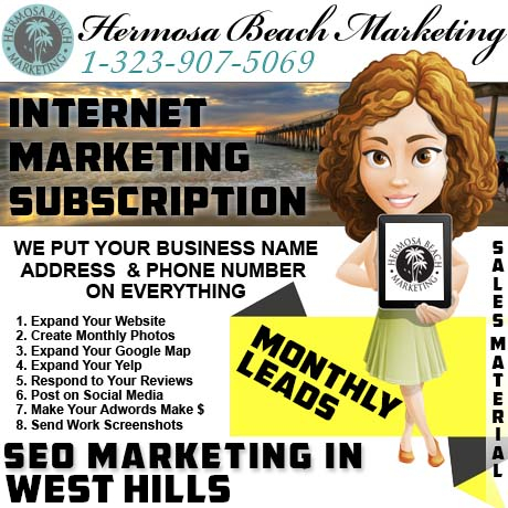 Are you sitting in “West Hills, CA” today trying to figure out how to make your home, boat, or boat motor payments this month? Try ordering our “seo internet marketing” bundle from Hermosa Beach Marketing. We’ll be doing all the heavy lifting on our keyboards for you, and you’ll be figuring out how to close deals on your phone. Most potential customers come from internet searches; so why touch a computer when you’ve proved to all of us that touching a computer is the reason that you can’t get things done in the first place?