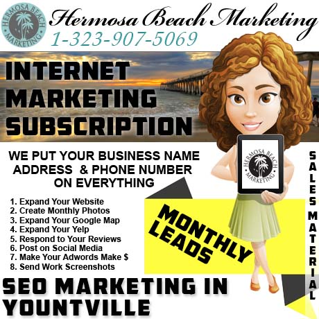 Hermosa Beach Marketing is a veteran-owned and operated business located in Los Angeles, California. We have a bundle that creates sales material for your new or existing business in “Yountville” which will use a process that we call “seo internet marketing“. You’ll never touch a website, computer program, setting, or otherwise to use our subscription that makes sales material.