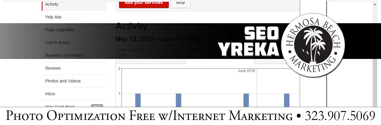 Hermosa Beach Marketing will (month-by-month) create sales material for search results WHEN YOU SUBSCRIBE to our standard plan for (computer) marketing labor, the PRESIDENTIAL POWER PACKAGE. We will promote your business from Los Angeles, California throughout the search results for “Yreka” and Siskiyou County. Sales material made with your business’ name, address, phone number, and logo will be shoved every which way into a search result environment (where you want it) (every month).