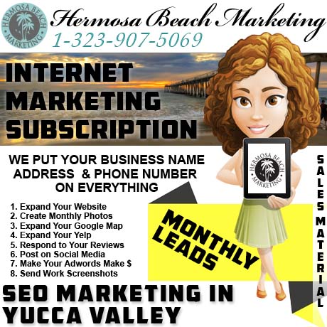 Hiring a pro “seo internet marketing” worker for your business in “Yucca Valley” is easy at Hermosa Beach Marketing. Even if it’s one guy for 4 hours a month, you’ll see some Photoshop advertising work with your business’ name, address, and phone number created on free and paid advertisements. Someone will login to your website, ensure that it’s working, update it if necessary, check the SSL certificate, and start a new page or more each month to make it bigger.
